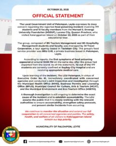 PALOMPON, LEYTE (October 24, 2025) — The local government of Palompon has expressed deep concern over a suspected food poisoning incident that affected more than 180 visitors — mostly students — who toured Kalanggaman Island earlier this week.