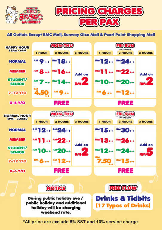 Karaoke Manekineko is excited to announce a brand-new pricing structure starting May 2025 for all outlets except BMC Mall, Sunway Giza Mall, and Pearl Point Shopping Mall. This refresh brings even more value to your singing sessions—perfect for solo fun, group gatherings, or family outings!
